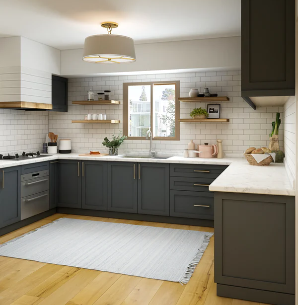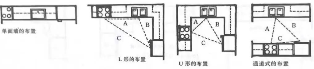 常见厨房布局有一字型、L型、U型、通道式几种。在设计时,首先要考虑动线合理以及人与家具之间的活动。