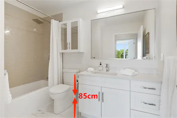 马桶左右两侧的预留距离建议大于20cm,前方至少要预留出40cm的空间,方便放脚和移动。