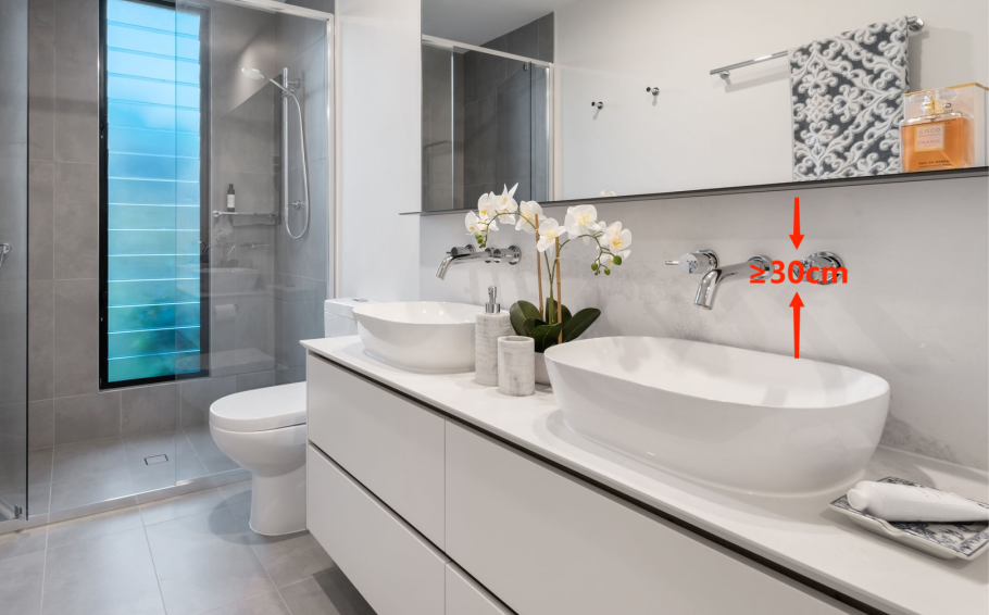 如果是镜柜,还要考虑镜柜底距离台面的距离,最好≥30cm,保证不影响水龙头或者柜门的开合。
