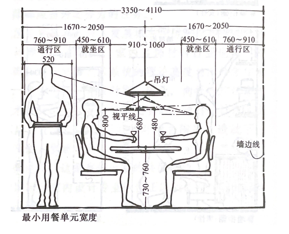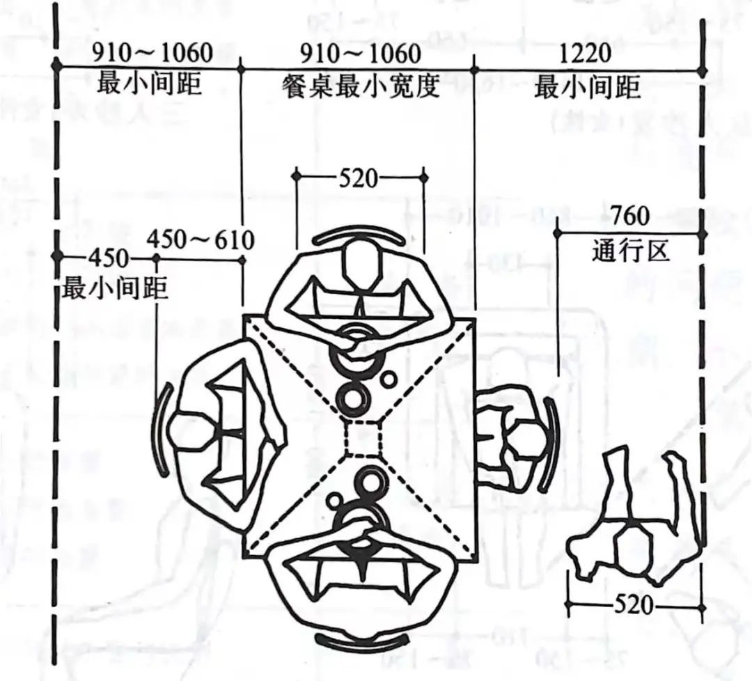但是无论是四人桌还是多人桌,就餐区域都要考虑座椅后的可通行间距,一般来讲,后方至少要留出60cm的可通行距离。